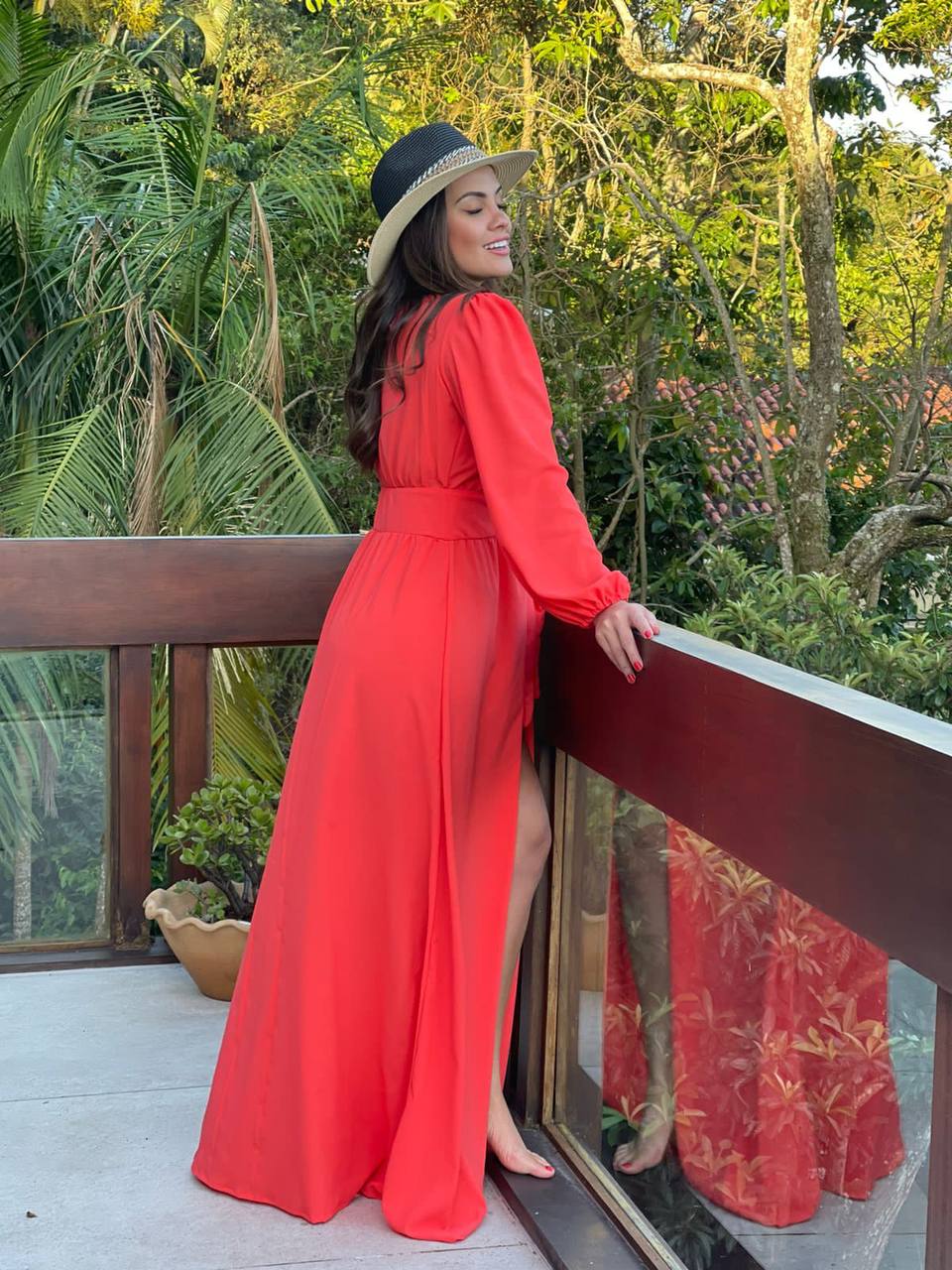 Saída confeccionada no tecido crepe, toque aveludado, saída longa com amarração frontal, manga comprida com detalhe de elástico no punho que possibilita manga ¾.